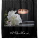 Eu criei esta design para o Produto da Cortina de Chás do Zazzle tirando uma foto no meu estúdio de uma flor de pénia cortada com botões atrás dela e colocando-a em uma Prateleira de cinzas com uma vela acesa atrás dela. Eu usava preto para o fundo e adicionava o texto "Um Momento Spa". - Sherry; Fotógrafo/Artista e Designer