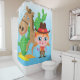 A vaqueira pequena amará esta cortina de chá que caracteriza uma vaqueira com tranças, chapéu de vaqueiro, laço, e o cacto do holsters assim como o verde e um cavalo marrom bonito em um fundo do azul do inclinação.