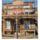 Velho cenário da cidade ocidental com impressão de casa de banho de hotel na cortina de chá.