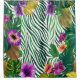Das Bild zeigt ein lebendiges Mosaik aus üppigen Monstera-Blättern in sattem Grün und Gelb, kombiniert mit prächtigen purpur- und orangefarbenen Blumen, die sich vor einem dynamischen, wellenartigen Hintergrund abheben. Es strahlt eine wilde, tropische Energie und eine fröhliche Fülle aus, die Neugier und Naturverbundenheit weckt.