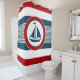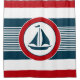 Design náutica com decoração em forma redonda de embarcações à vela, em fundo listrado, a azul, vermelho e branco
