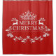 Cortina de chá mostrada em cor vermelha com um feriado festivo impressão de Natal Feliz. Personalize este item alterando as cores do fundo ou do comprar como está.
