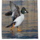 O pato de Goldeneye masculino batendo suas asas no gelo. Foto de ruth jolly vê também produtos correspondentes.