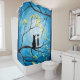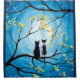 Dois gatos sentados em um galho observando a lua de cheio com um céu azul cheio de estrelas. Os ramos das árvores ao seu redor com pequenas flores amarelas. Gato de tuxedo preto e um gato branco bicolor e cinza pintado. Pintura acrílica branca moderna original de Donna Leger. Todos os Direitos Reservados. ©irony designs