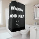 Esta é uma cortina de chá preta legal da cor com o provérbio "QUER JUNTAR-SE ME?" escrito em letras brancas enormes acima de uma cara engraçada.