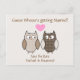 Casamento bonito e personalizado Salve os cartões postais de Data, com gráficos doces de duas corujas marrons e bolinhas bronzeadas, com um coração cor-de-rosa entre elas. O texto castanho e cor-de-rosa, na frente e atrás do cartão, está pronto para personalizar para ler o que você quer. Excelente maneira de anunciar seus planos de casamento cedo.