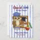 Encantada formatura acadêmica no boné Mortar sentada em alguns livros ao lado de uma fronteira de fotos de conselho de giz. Fundo de faixa azul clara. Substitua a foto e personalize as áreas de texto na frente e atrás.