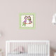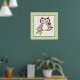 Coruja de primavera em um galho de impressão de poster, apresentando uma coruja de primavera fofa em castanho roxo e escuro segurando uma flor em seu bico (conta) em um galho e borda de xadrez verde. Um design adorável para amantes de coruja perfeito para a decoração infantil. Trabalho de arte por Trina Clark.