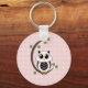 Chaveiro de Botão Básico Personalizado com um design de arte de vetor de uma coruja rosa, branca e preta giro em um galho em forma de lua crescente com folhas e um fundo de bolinhas rosa.