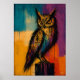 Um retrato de coruja imponente renderizado com linhas expressionistas cruas e blocos de campos de cores luminosas. O olhar penetrante, as marcações simbólicas e o contraste vívido criam um senso ousado de sabedoria, mistério e energia noturna, transformando esta obra de arte em uma peça focal impressionante para interiores modernos e colecionadores de arte animal expressiva.