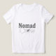 Uma ilustração de corvo com estilo retrô e letras ornamentadas "Nômade", perfeita para roupas boho e inspiradas na natureza. Este gráfico de andarilho combina arte animal minimalista com estética de tatuagem retrô para uma peça única.
