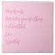 A rosa claro de mês de consciência do câncer de mama sólido de cor simples, o texto personalizado personalizado de texto personalizado, de cor simples, moderno, na moda giramente giro, cita o azulejo de cerâmica. Texto de script cor-de-rosa totalmente personalizável no fundo de cor simples da rosa claro. Você pode escrever uma nota pessoal, uma citação ou frase favorita, uma citação ou poema inspiracional, motivacional, etc Excelente como presente, favor ou lembrança. Durante a Mês de consciência do câncer de mama em outubro e ao longo do ano, as pessoas vestem fitas cor-de-rosa para homenagear sobreviventes, lembrar-se dos que perderam a doença e apoiar o progresso que estamos a fazer para derrotar o cancer da mama.