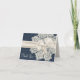 Cartão de agradecimento de casamento elegante feito em gráficos que parecem um padrão de damasco de jeans azul. Gráficos adicionais de uma renda bege como um centro de mesa decoram a frente do lado direito, e uma fita e laço de cetim bege estendem-se pelo meio do cartão. O texto bege na frente lê-se Agradecimento. Personalize o texto na frente e o texto azul dentro para atender às suas necessidades. Uma maneira encantadora de enviar seus agradecimentos após o casamento.