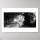 Numa manhã gelada, de outono, o sol brilhante ilumina uma estrada rural em Cheshire, Inglaterra. Foto preta e branca com borda branca para fácil enquadramento ou suspensão.