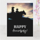 Cowboys cowboys cavalos saudando cowboys de cartas de aniversário na silhueta do pôr do sol, fundo negro, roteiro branco ocidental e moderno.
