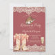 Chapéu de vaquinha, botas e um copo de champanhe com pérolas e rendas em fundo vermelho.