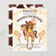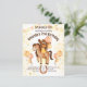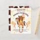 A cowgirl da pele marrom e bonita sela o modelo do convite para o aniversário. Garota cavalgando cavalo bebê bonitinho com balões e bandeiras no fundo. Cor da fazenda amarela castanha.