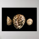 Uma fotografia de vida estática de três conchas avistadas alinhou-se, com a maior no meio, sobre um fundo preto.