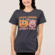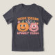 Cute Halloween Thighs Espesso Vibes Spooky Vibes Pumpkins Tri-Blend Shirt apresenta o texto "Coxas grossas e vibrações assustadoras" na tipografia moderna com destaque para as abóboras bonitinhas cor-de-rosa e laranja. Perfeito para festas de Halloween e comemorações. Criado pelo Evco Studio www.zazzle.com/store/evcostudio