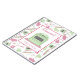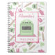Um caderno da receita que caracteriza um design temático do cozinhar que consiste em misturadores da mão, luvas do forno, colher de madeira, pinos do rolo, espátula, whisks, e fogão retro. O design tem um esquema de cores cor-de-rosa e verde. Personalize com seu nome.
