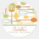 Os instrumentos coloridos para cozinhar e alimentação estão representados neste encantador adesivo para um Chá de panela de "estoque a cozinha" para a noiva-a-ser. O esquema de cores é neutro e retrô em tons de ouro mudos, verde-sábio, castanho e laranja. Um toque de ric rac falso dá-lhe uma sensação vintage também!