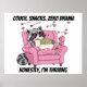 A humorous poster of a raccoon in pajamas lounging on a couch with snacks for a cozy Valentine's Day.