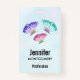 Nomeie o crachá com um design bonito. 3 borboletas de aquarela, pintadas de rosa, roxo e verde. Um fundo de aquarela azul claro com pistas de rosa claro