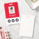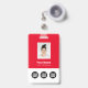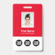 Personalize facilmente este Crachá de Nome de Funcionário Personalizado com Foto, Código de Barras de Digitalização e 3 Logotipos Empresariais Múltiplos. Você pode carregar 3 logotipos de empresas diferentes, perfeito para parcerias e patrocinadores. Um design empresarial simples em cores vermelhas e brancas totalmente personalizável nas tamanhos da frente e verso, fontes básicas sem serifa e modernas e uma aparência profissional e clara. Disponível com cordão, clipe de metal ou retrátil. Sem pedido mínimo.