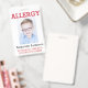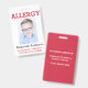 A foto feita sob encomenda caçoa o crachá de advertência alerta da alergia ICOE. Anexo através de uma correia, de um grampo do metal, ou de um grampo retrátil a um saco de livro, a um jogo da medicina ou para que uma criança vista-se. Personalize com suas alergias, informação do contato ou instruções da emergência. Adicione a foto da sua criança à parte dianteira. Edite para mudar cores da pia batismal e do fundo ou estilo do texto. A informação pode ser escrita na parte dianteira ou na parte traseira. www.LilAllergyAdvocates.com