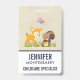 Dê um crachá com uma ilustração fofinha apresentando um veado bebê e um pequeno esquilo segurando uma bolota e uma borboleta voando sobre suas cabeças. Estas adoráveis criaturas de floresta em pé sobre uma grama com alguns cogumelos brancos perto de seus pés. Fundo castanho macio.