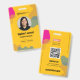 This vibrant and modern employee ID badge features a striking yellow background adorned with abstract, flowing shapes in pink, olive green, and grey. Designed for professionalism with a touch of artistic flair, it's perfect for any organization looking to make a memorable impression. The layout includes ample space for a photo, name, title, and ID number, ensuring essential information is clearly visible. On the reverse, a dedicated section for validity dates and a QR code provides easy access to digital information and contact details, including email and address. Elevate your company's identification with this uniquely designed and functional badge.