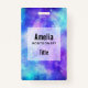 Crachá de nomes com fundo abstrato cósmico. Cores vibrantes girando de azul claro, rosa e roxo. Estrelas brancas espalhadas ao redor.