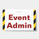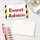Este design de crachá atraente apresenta a mensagem "Administrador de eventos". Também apresenta faixas de precaução amarelas e pretas. A parte traseira apresenta um nome de evento personalizável e data(s) de evento. [~Z0000286]