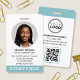 Faça uma impressão profissional com este na moda e o crachá moderno de identificação. Um modelo de dois lados mostrando sua foto de identificação dentro de um quadro circular e personalizado com seu nome, detalhes comerciais, logotipo e um código QR digitalizável. Personalize o texto para se adequar à sua empresa. Perfeito para um Notário Público, Agente de Assinatura de Empréstimo, Agente de Entrega de Confiança Notária Certificada, CNTDA, Notário Móvel, Apostille, profissional legal ou outro funcionário de negócios. Design cores impressas: azul-turquesa, preto e branco. Compre a coleção on-line para obter ideias e suprimentos de produtos mais populares, projetados para notários!