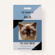 Name badge featuring your own custom photo or logo and texts on a geometric design blue and black background