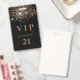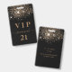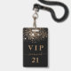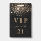Um crachá moderno, na moda e glamouroso para uma festa de aniversário 21 (ou qualquer idade). Um fundo preto com brilho de ouro falso. Personalize e adicione um nome. O nome é escrito com um moderno estilo escrito à mão com traços. O texto: VIP Number 21 é gravado a uma cor de ouro. Para manter as hastes, exclua apenas o nome da amostra, deixe os espaços ou emoji na frente e depois do nome. Voltar: detalhes da sua festa.