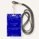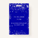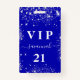 Um crachá moderno, na moda e glamouroso para uma festa de aniversário 21 (ou qualquer idade). Um fundo azul real com pó falso prateado. Personalize e adicione um nome. O nome é escrito com um moderno estilo escrito à mão com traços. O texto: VIP Número 21. Para manter as hastes, exclua apenas o nome da amostra, deixe os espaços ou emoji na frente e depois do nome. Voltar: detalhes da sua festa.