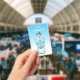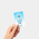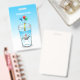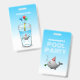 crachá de aniversário da piscina com uma ilustração fofa de uma baleia. A baleia está vestindo um chapéu de festas listradas vermelho e branco e começou a festa de aniversário que acontece em um copo d'água cheio.