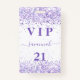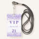 Um crachá moderno, na moda e glamouroso para uma festa de aniversário 21 (ou qualquer idade). Um fundo branco com poeira brilhante violeta e lavanda. Com o texto: VIP. Personalizar e adicionar nome, idade, endereço/data. O nome é escrito com um moderno estilo escrito à mão com traços. Para manter as hastes, exclua apenas o nome da amostra, deixe os espaços ou emoji na frente e depois do nome.
