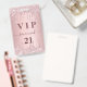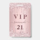 Um crachá moderno, na moda e glamouroso para uma festa de aniversário 21 (ou qualquer idade). Um fundo metálico rosado pincelado e fino, com pingar de falso brilho, pintura pingando. Personalize e adicione um nome. O nome é escrito com um moderno estilo escrito à mão com traços. O texto: VIP Número 21 é escrito em cor rosa dourada escura. Para manter as hastes, exclua apenas o nome da amostra, deixe os espaços ou emoji na frente e depois do nome. Voltar: detalhes da sua festa.