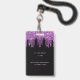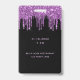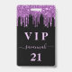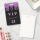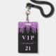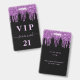Um distintivo moderno, elegante e glamoroso para uma festa de aniversário de 21 anos (ou qualquer idade). Fundo preto com brilho falso roxo, efeito de tinta pingando. Personalize e adicione um nome e idade 21. O nome é escrito com um estilo de letra manuscrita moderna com floreios. O texto: VIP og Número 21 é escrito em cor rosa claro. Para manter os floreios, apenas exclua o nome da amostra, deixe os espaços ou emojis na frente e depois do nome.