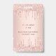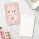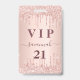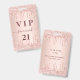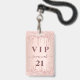Um crachá moderno, na moda e glamouroso para uma festa de aniversário 21 (ou qualquer idade). Um fundo metálico rosa dourado falso com aspecto rosa dourado e gotejamento brilhante, aparência de pingar tinta. Personalize e adicione um nome. O nome é escrito com um moderno estilo escrito à mão com traços. O texto: VIP Número 21 é escrito em cor rosa dourada escura. Para manter as hastes, exclua apenas o nome da amostra, deixe os espaços ou emoji na frente e depois do nome. Voltar: detalhes da sua festa.