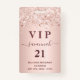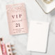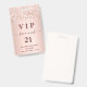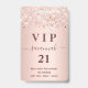 Um crachá moderno, na moda e glamouroso para uma festa de aniversário 21 (ou qualquer idade). Um fundo metálico falso de rosa dourado com poeira falsa brilhante. Com o texto: VIP. Personalizar e adicionar nome, idade, endereço/data. O nome é escrito com um moderno e escuro, rosa dourado, escrito em estilo manuscrito, com traços. Para manter as hastes, exclua apenas o nome da amostra, deixe os espaços ou emoji na frente e depois do nome. Traseira: sem design ou cor (menos dispendioso) Este crachá também está disponível em nossa loja com design no verso.