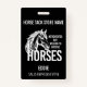 Engraçada loja de tachos de cavalos, nome do representante de vendas, crachá. Negócios de equipamento de cavalos. Apresentado, mas disposto a discutir cavalos design engraçados em preto e branco com gráfico vetorial de cavalo.