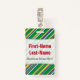 Este design crachá apresenta um padrão de listras (ou linhas) de várias larguras, verde, amarelo, azul ou branco. Essas cores foram inspiradas pelas da bandeira nacional do Brasil. Ele também apresenta um nome personalizado em texto vermelho dentro de uma área clara. Há também uma mensagem personalizada sob o nome que pode mostrar informações como um nome de função de cargo, uma profissão ou um nome de empresa/empresa. [~Z0000176]