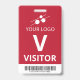 Crachá de visitante vertical com um design simples em branco contra um fundo vermelho fosco. Um grande V branco facilita reconhecer rapidamente o visitante como tal. Personalize com o logotipo da sua empresa e um código de barras.
