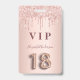 Um distintivo moderno, elegante e glamoroso para a festa de 18 anos de uma garota. Um fundo metálico dourado rosado falso com um brilho elegante em dourado rosado, imitando um efeito de gotejamento de tinta. O nome é escrito com um estilo de letra manuscrita moderna em cor dourada rosada escura. Com o texto: VIP O número 18 é escrito com uma fonte estilo balão.
