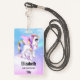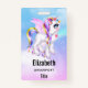 Crachá personalizado com a imagem de um unicórnio com grandes olhos azuis, asas cor-de-rosa e um arco-íris e cauda. Kawaii fofo.
