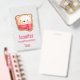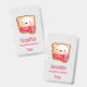 Um nome de etiqueta com um rosto de urso fofo e adorável colocado em uma base de biscoitos. Vestindo um cachecol listrado vermelho e branco. O fundo é um padrão que tem a aparência de cair neve, em prata e branco.