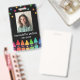 Crachá de identificação de professor de lápis de lápis vertical personalizado com foto, nome, nota sob estrelas coloridas e acima de uma fila de lápis de lápis num gradiente do arco-íris. Crachá de identificação do professor do jardim de infância com lápis coloridas e estrelas.